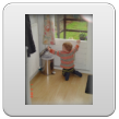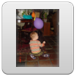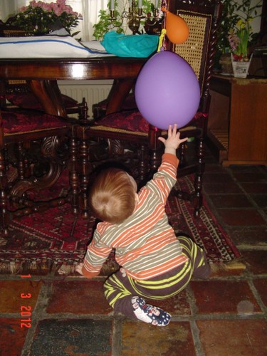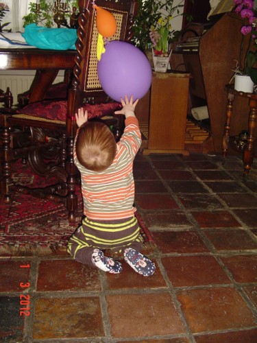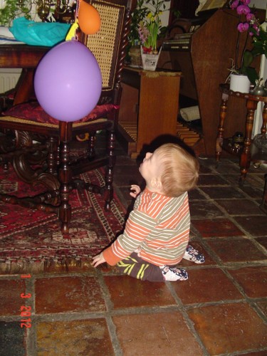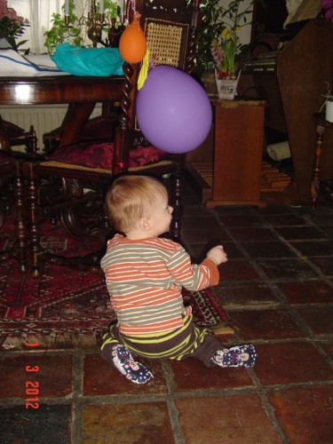 Bart begint met een rondje kamer en keuken, inspectie van pedaalemmer en katteluik en even naar buiten kijken. Fles met drinken maken en weer terug naar de kamer en drinken. Mooie plantjes op de houtkist, oh mag niet, dan even op de orgelpedalen klimmen, muppets bekijken en de ballonnen zijn leuk om tegen aan te meppen. Op het kleed speelgoed checken, blokken onder de stoel, even naar het raam naar buiten staan kijken, staan bij de stoel, de bank, de tafel.