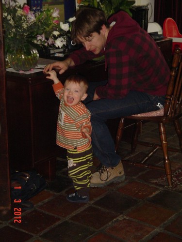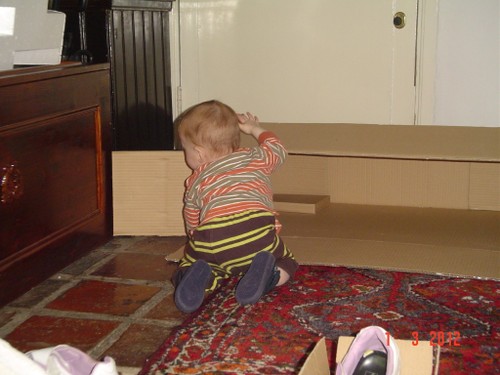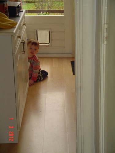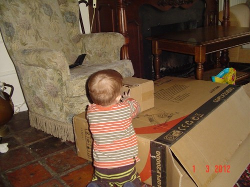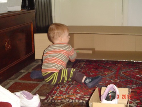 Papa is boven en Bart even in de box zodat ik kan inpakken. Bart moppert, ik haal hem weer uit de box met een paar schrammen op z'n wang van het kleine doosje. Dus dat ding ook weg en weer spelen op het kleed, maar Bart is nu echt moe en wil steeds vaker op schoot, we gaan in de stoel naar buiten kijken. Dan nog even naar boven om papa's werk te bewonderen.