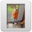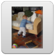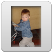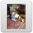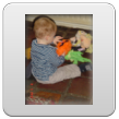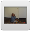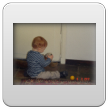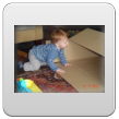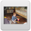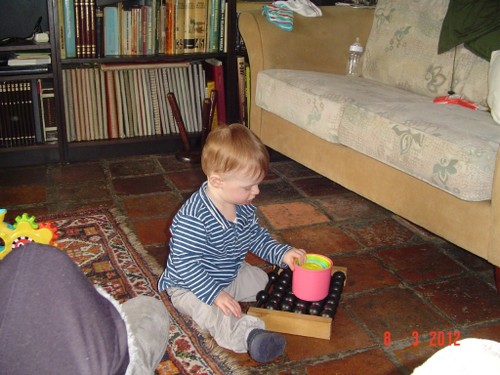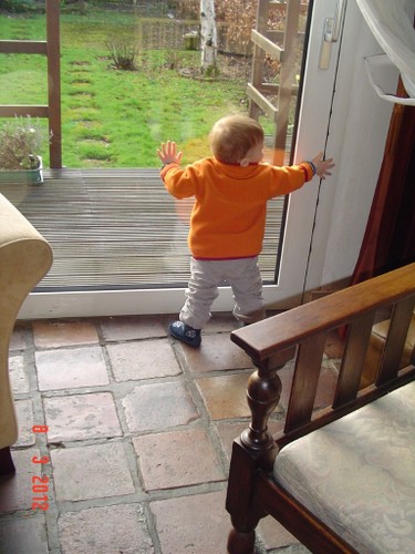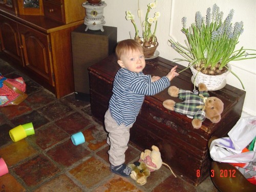 Bart wil nog niet spelen maar op schoot, kijkt me aan, kijkt en wijst dan naar de cd-speler, o pardon, ik had vergeten de muziek aan te zetten, grijns. Meneertje zit rustig op schoot te luisteren, ik voel even aan z'n hoofd: nee, geen koorts, dan zeker een filosofische bui. Na 10 min.: kom, ga je mee drinken maken? Bart scheurt achter me aan naar de keuken en weer terug, roosvicee drinken (half flesje) en berekoek eten. Nu heeft meneertje bijgetankt en gaat aan de slag. Spelen, kruipen, staan, naar de gang, terug, blokken, naar de keuken, katteluik, terug kamer, naar het raam naar buiten staan kijken en af en toe op schoot bijtanken met blubberknuffels. Kruipen, staan, keuken, kamer, open haard - nee, poken - nee, boekenkast - nee, plantjes - nee, ballenbaan - muziekje - grijns, ringen - goed zo!