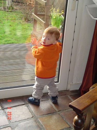 Bart drenst, op schoot op de bank voor het raam, blubberknuffels. Begint al gauw weer te klauteren en te klimmen dus op het kleed. Heeft nu geen behoefte meer aan grote tochten en doet nu het kleine grut: bekers in elkaar en blokjes op elkaar, goed zo!