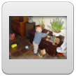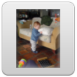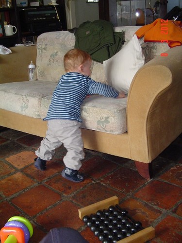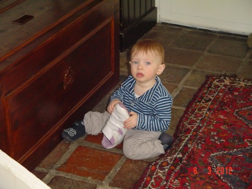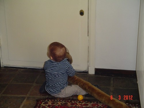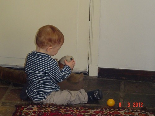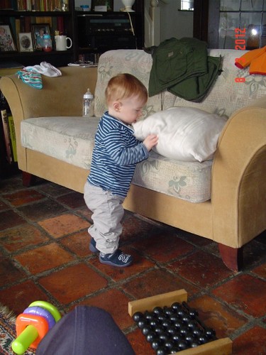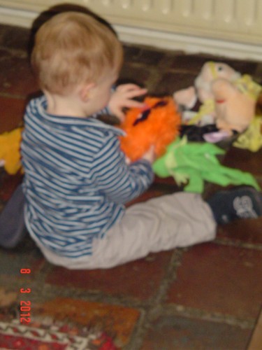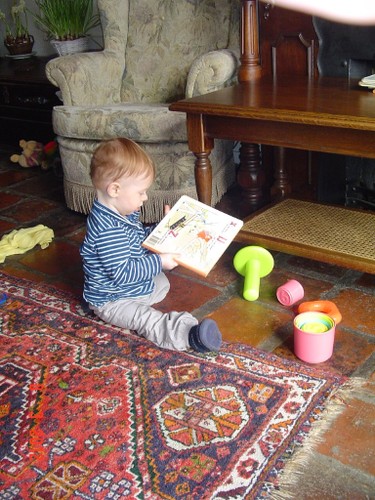 Kom baas, even schone luier. Plassertje is rood, oei, in de gaten houden, erytheem is duidelijk begrensd, ontsteking? Dan verder spelen, rest berekoekje eten en wat drinken. Berentas leeghalen, plantjes "bekijken" en worstelen met het kussen op de bank. Bart probeert het poe-boek en het abc-boek te lezen, maar dat is motorisch te hoog gegrepen, krijgt de boekjes vaak niet open en slaakt gefrustreerde èè-kreten en hapt in het poe-boek en kauwt. Bah geen boek eten, ik haal een stukje karton uit z'n mond en leg de boekjes weg, ga je mee?