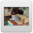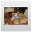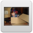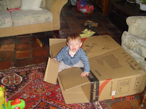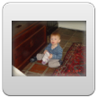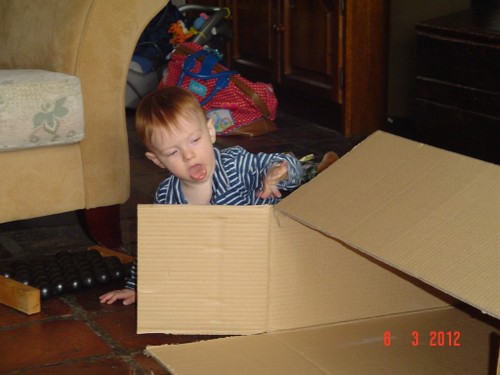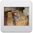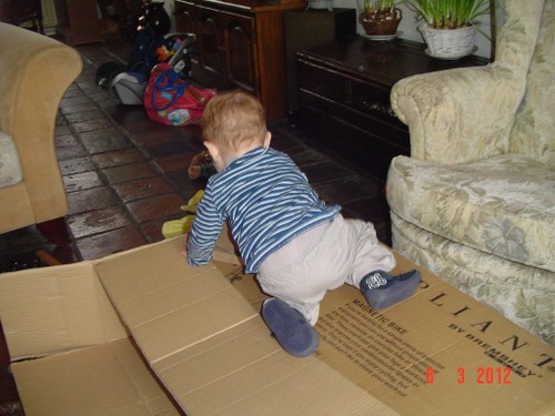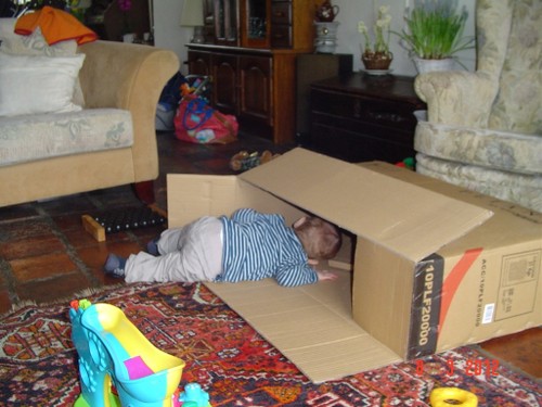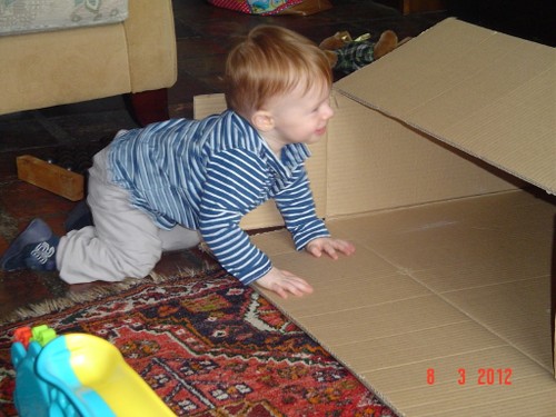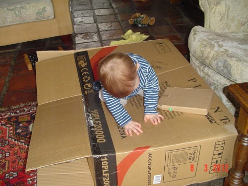 We gaan opruimen. In konvooi naar de keuken, deur open, luier weg, Bart voelt aan de groene buitenmat. Katteluik, pedaalemmer trommelen, keukenkastjes - nee, gasfornuis - nee, stok zonwering - nee, Bart gaat even zitten peinzen. Tijd voor andere actie: kom maar, ik loop naar de hal en pak de doos, Bart spurt achter me aan de kamer in en gaat als een echte bouwvakker aan de slag. Kleppen open en dicht, klimt boven op de doos, steunt met z'n handen op de stoelzitting maar besluit om daar toch maar niet op te klimmen (ik: zucht). Weer eraf, erop, eraf, kleppen, erop en dan knakt het karton en wordt de doos een glijbaan, Bart roetsjt naar beneden, maar da's gek! Zodra hij omhoog worstelt, begint hij weer naar beneden te glijden, Bart kijkt me grijnzend aan. Omhoog - terugglijden, omhoog - terugglijden. Dan vanaf de zijkant erop, ha! Maar zodra hij in het midden komt, glijdt hij weer naar beneden. Dan maar de beren pakken en die in de doos stoppen, helemaal achteraan, en er weer uit halen.