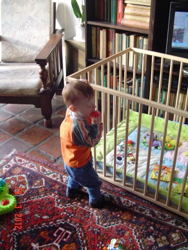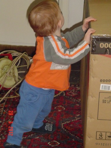 Bart zit te persen en kijkt me met een rood hoofd aan, zit er een poepie in je broek? Klaar met persen en speelt verder met blokken. Dan komt hij langskruipen en verspreidt een fikse walm, dus schone luier. Oogst is een klein hard keuteltje. Weer verder, keuken, hal, kamer, bureau, kleed. Af en toe staan tegen de box om A.J. Kwak te kijken. Lawaai buiten: bij het raam kijken naar een vrachtwagen die bezig is en commentaar leveren. Batterijen fototoestel zijn leeg, gauw even opladen.