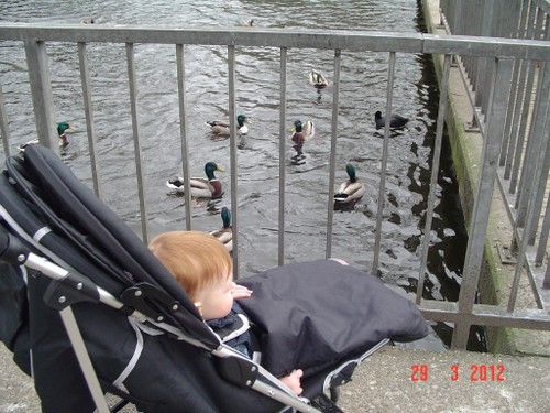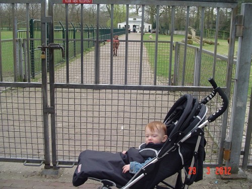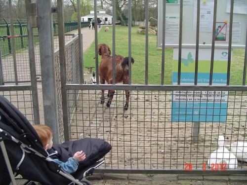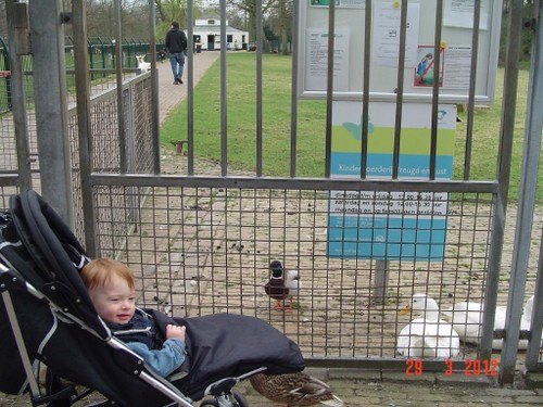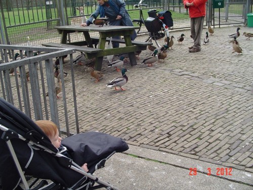 Bij het park uitladen, Bart kijkt en kijkt, wat gaat er nu gebeuren? Wandelen en naar de dieren, er zijn mensen eenden aan het voeren dus het is een cacafonie van kwakende en krioelende eenden. Bart kijkt z'n ogen uit, vooral als eenden om z'n buggy drommen en een hele grote witte over de rand van z'n dek komt kijken. Eenden hebben het brood op en de massa dunt langzaam uit. Nu wordt een geit gevoerd, Bart wijst. Herten komen erop af en een gans. Bart ligt in de "bestudeermodus", maar komt steeds overeind om beter te kunnen zien. Het voeren is afgelopen en verzorgers nemen de beesten mee. We gaan het park in en Bart ligt te zingen: aaaaaah, uuuuuuh, beeeeh, aaaaaah. Mijn hoop dat hij zou gaan slapen, vervliegt.