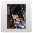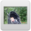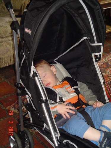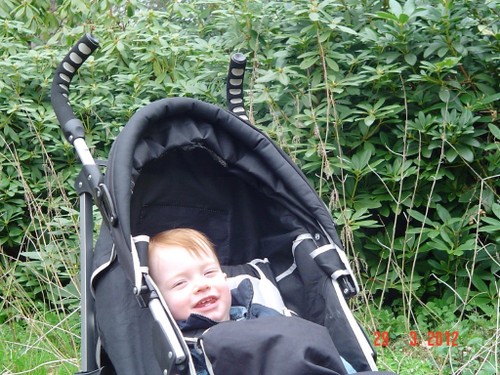 Bart wordt mopperig, op schoot, nee toch maar niet, spelen, nee toch niet, op schoot, moppert en kronkelt. Genoeg! In de buggy.