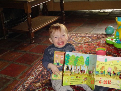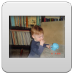Papa is er, Bart wordt wakker en grijnst. Naar binnen en nog even spelen. Ik vertel papa over Bart's reactie van gister op een anoniem telefoontje dat ik nooit aanneem en die wil dat wel eens zien en gaat dus bellen. Ik heb het niet gelijk door en neem de telefoon op, maar papa legt de bedoeling uit. Ik loop terug naar de bank en Bart zit gespitst/verbaasd te kijken. Nog een keer. Papa belt, ik loop naar de telefoon, kijk naar het nummer en zeg net als gister nee hoeft niet. Ik laat de telefoon lopen en ga terug naar de bank. Nu vindt Bart het tijd om in te grijpen. Hij scheurt naar de telefoon, gaat zitten met z'n linkerhand aan z'n oor, wijst en roept: aan-aan. Nee hoeft niet. Bart trekt zich op aan de deur, nog dichterbij het apparaat en wijst: aan-aan. Nee hoeft niet. Bart kijkt ons verwijtend/vragend aan, nee hoeft niet en we moeten lachen. Bart kruipt terug naar het kleed, maar begrijpen doet hij het niet. Maar omdat wij lachen, vindt hij het niet erg, hoewel hij af en toe nog even omkijkt: aan. Dan bekijken we nog even de foto's.