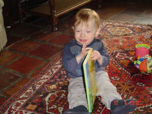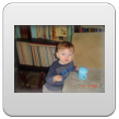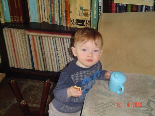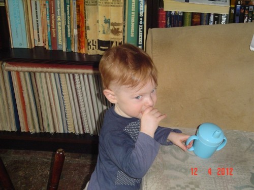 Ik maak aanstalten om naar de keuken te gaan en Bart heeft dat direct in de smiezen. Ik hoef hem niet te roepen, hij komt direct achter me aan. Ik eet een boterham en maak nieuwe roosvicee, houd ondertussen de kastjes dicht. Bart trekt zich steeds aan m'n benen op en wil knuffels, tussendoor drinken. Dan terug naar de kamer, ik probeer hem te laten lopen, maar halverwege protesteert hij. Optillen en op de bank op schoot. Wat is er mannetje, nog wat drinken? Na een paar slokjes gaat Bart achterover op het kussen liggen. Aha, moe, wil je slapen? Ik installeer hem in de buggy naast de bank terwijl hij me tevreden lodderig aankijkt.