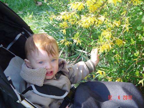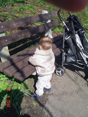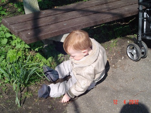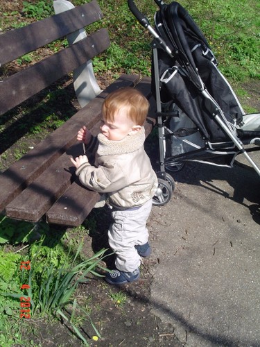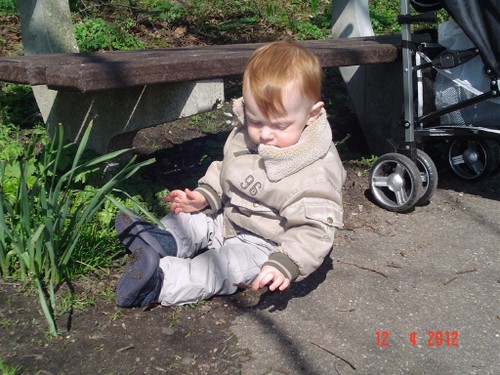Naar het park. Eerst de eenden brood geven, Bart zit helemaal rechtop en kijkt van links naar rechts. Eenden kijken in z'n buggy en Bart kijkt terug. Handjes binnenboord mannetje! Dan verder wandelen, Bart "zingt", ba-ba, an-an, be-an-ba. Bij een bankje langs de Vliet uit de buggy, stokje pakken van de grond, stokje breekt, Bart gaat in de modder zitten om meer stokjes te pakken. Broek, schoenen en handjes modderig. Kom we gaan verder. Bart zingt weer. Bij een struik forsythia even stoppen. Leuk, bloemblaadjes kijken/plukken, zachtjes! Nog even naar het park met de grote bomen aan de overkant, we stoppen bij een oude beuk, maar Bart wil de boom niet aanraken ook al doe ik het voor. Nog even terug naar de dieren, de geiten staan bij het hek, maar Bart daar heeft nu geen belangstelling voor, er zijn nu meer mensen: moeders/oma's/opa's met buggy's en dat vindt Bart veel interessanter.