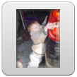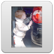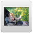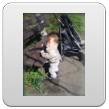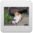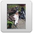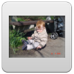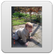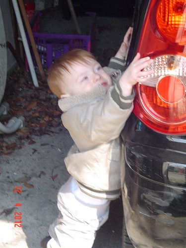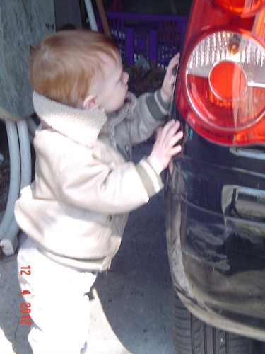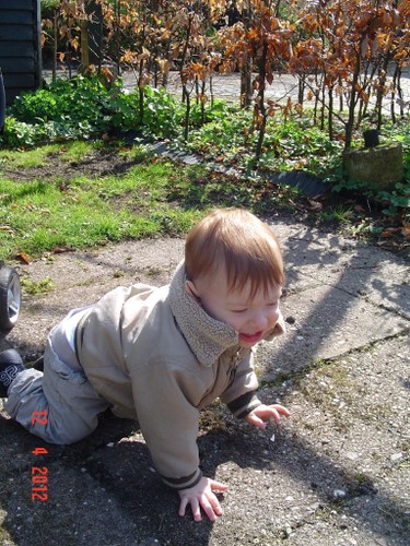 We zijn weer thuis, ik laad de buggy uit en zet Bart even naast de auto zodat ik die kan afsluiten zonder gezeul (hij is behoorlijk zwaar aan het worden!) Bart vindt het prachtig en bekijkt de bezinedop en de achterlichten. Dan in de buggy en nog even in de tuin want het is mooi weer. Bart voelt voorzichtig aan de tegels van het terras en vindt het een beetje eng. Gaat zitten en voelt nog eens en kijkt rond. Een haan van de buren kraait, Bart kijkt en wijst, ja kukeleku, grijns. Voorzichtig probeert hij weer te kruipen en pakt minuscule moddertjes/takjes/mosjes en wil dan knuffels.