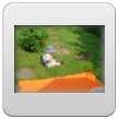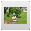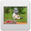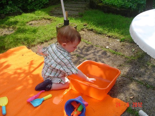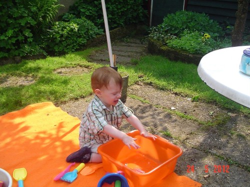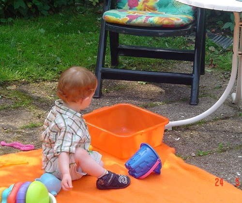 Genoeg van de buggy, schone luier, even op schoot, t-shirt uit en dan verder spelen. Ik haal gauw teiltje uit de tuin, 5 mm water erin en lekker spetteren, dat frist op. Teil wordt beetje leeggekieperd, leuk, plasje water op de grond, spet-spet.