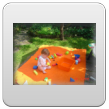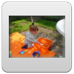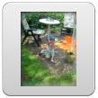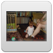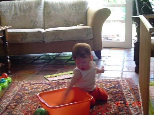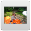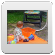 We gaan naar buiten. Bart is weer vrolijk en duikt direkt op de teil met water af. Oeps, die kiepert bijna om door z'n enthousiasme, gauw overtollig water eruit, 2 cm is genoeg. Bart spettert en petst, schepjes erin en eruit. Ik spuit met het waterpistool op de boom en krijg het steeds weer in m'n hand gedrukt: nog een keer. Dan weer verder spetteren, kleren nat, benen nat, daar koelt hij lekker door af. Na een half uurtje verder onderzoek van de tuin, grassprietjes plukken, madeliefje ontleden, en op het terras takjes en steentjes verzamelen en aan mij geven. Tussendoor steeds knuffelen en een slokje drinken. Weer spelen met schepjes in het water en waterpistool, blokken en ringen in en uit de emmer. Staan bij de tafel en de stoelen.