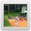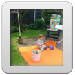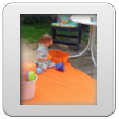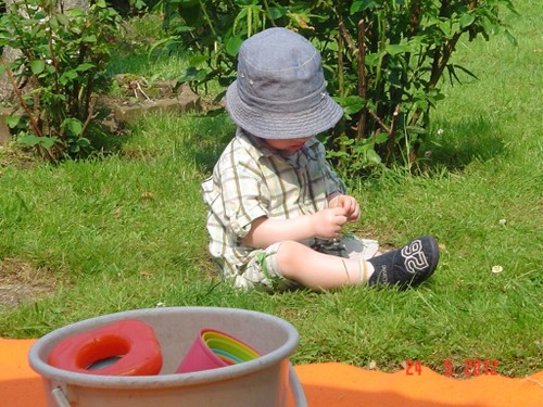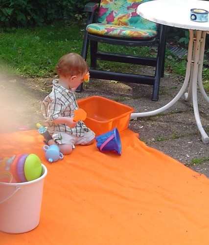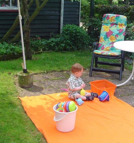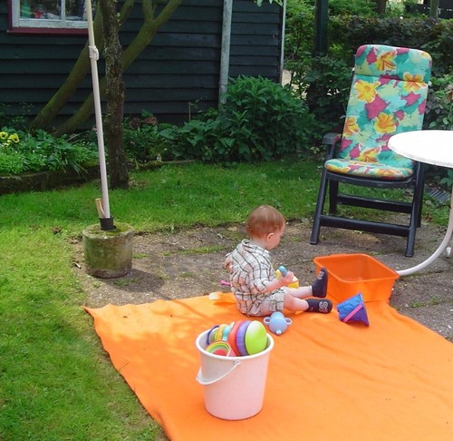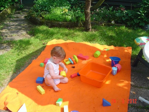 Nog even in de tuin in de schaduw, er staat een lekker windje. Verder spelen met water/stapelbekers/blokken.