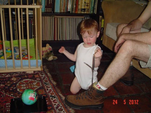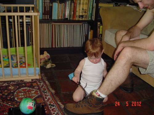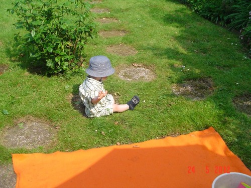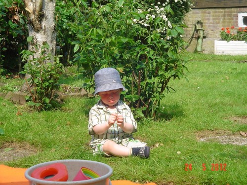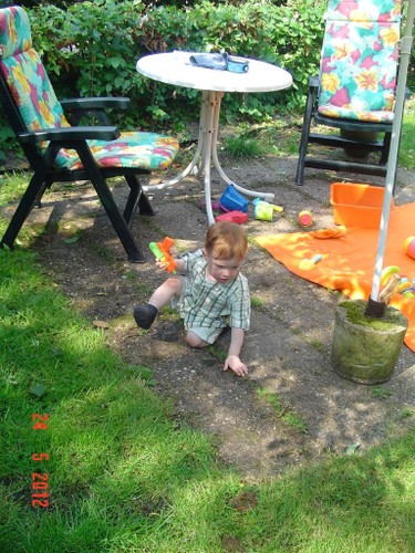 Papa is er en heeft ook schoenen aan. Bart gaat fanatiek de veters lostrekken. Nog even in de tuin, waterspetteren, waterpistool laten zien. Kruipen in gras, modderige handjes/voetjes. Dan wordt het toch weer te warm, naar binnen en pootjes schoonspoelen onder de kraan. Nog even spelen, drinken.