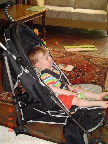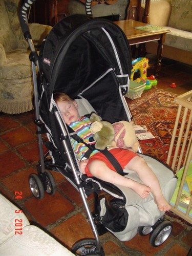 Terug naar de kamer, wil op schoot knuffelen en gaat dan liggen. Tja baas, beetje te kort geslapen, nog even in de buggy dan. Bart vindt het best, leest z'n boekje en kijkt soezerig naar de Giro. Rest roosvicee drinken en daarna water. Het is 26' in de kamer.