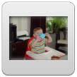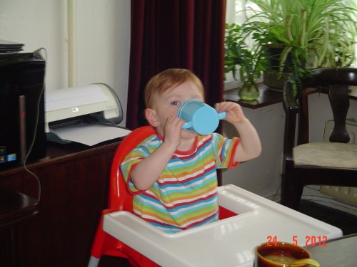 Naar de keuken, fruithap maken, in de kinderstoel opeten, Bart drinkt uit z'n beker.