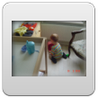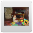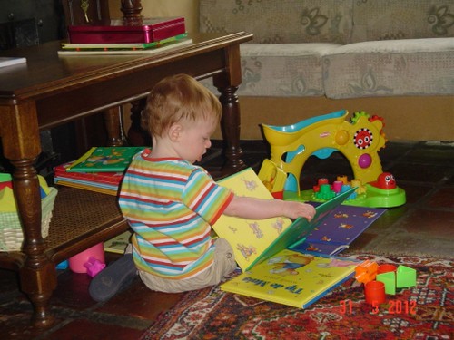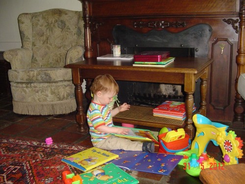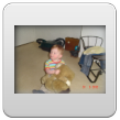 Even schone luier, verder spelen, rest berekoek opeten en wat melk drinken. Bart wordt weer hangerig, wil steeds op schoot, we gaan het kleine boekje lezen: hij pakt m'n hand: ik moet de plaatjes aanwijzen maar dat draai ik om, pak zijn handje en laat hem aanwijzen. Waar is schoen? Bart feilloos eigen schoen en mijn pantoffel: an! Bal, waar is bal? Bart glijdt van schoot af en pakt de bal, ga maar gooien, ik gooi terug, lol. Goed zo! Weer op schoot, beer, waar is beer? Bart duikt in de tas en haalt beer tevoorschijn. Goed zo! dat is beer. Klok, waar is klok? Bart kijkt rond. Ik houd het plaatje naast de klok op de schoorsteen, nou ziet hij het: kk-kk, precies, klok. Goed zo! Weer op schoot, Trommel, ik haal een oude pollepel uit de keuken en mep op de koektrommel. Bart neemt over en slaat er deuken in. Trommel, ja. Dan vindt hij het genoeg, weer op schoot, flikkert het boekje op de grond, geeuwt en wrijft in z'n ogen.