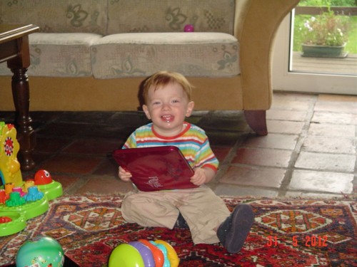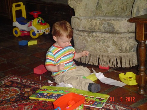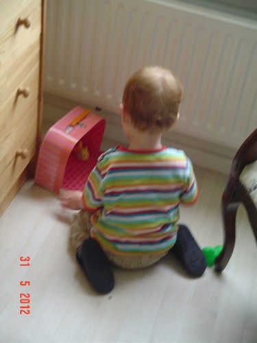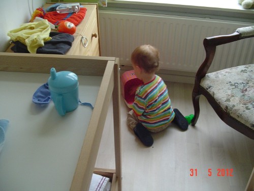 Uitgebreid mama knuffelen en uitzwaaien en dan weer teruglopen naar de kamer. We gaan de tas uitpakken, Bart pakt z'n popje eruit. Ik ga weer naar de keuken drinken en berekoek halen. Bart kijkt met z'n koppie om de hoek van de kamerdeur en kruipt dan achter me aan naar de bank. Nee, niet echt zin in koek en drinken, na een paar hapjes/slokjes vindt hij het genoeg. Exantheem op armpjes, ws. geen allergie, geen jeuk, geen pukkeltjes, 5e t/m 10e ziekte (vul maar in), geen temp. Van m'n schoot af, ga maar bij de tafel kijken en ja hoor, feilloos haalt hij daar het nieuwe speelgoed als eerste vandaan. Eerst de vormendoos, leegkieperen, samen proberen. Dan de stapel boekjes onderop, het ene na het andere boek wordt snel doorgebladerd, ik haal ze maar weg want dat is veel te veel, was ook niet de bedoeling dat hij die zou pakken maar ik had vergeten ze weg te leggen. Alsnog dus. Niet erg, Bartus ontdekt nu de wascokrijtjes, ik maak het bakje open, geef een blaadje tekenpapier en doe het voor. Ja leuk, Bart krast wat met de krijtjes ondersteboven, stopt dan de krijtjes onder de stoel en begint papier te scheuren, veel leuker. Ondertussen kwijlt hij enorm. Papier aan snippers, mooi, naar de loopauto, met een noodvaart scheurt Bart naar de telefoon en zit daar klem tussen deur en bureau, achteruit kan hij nog niet dus hij bonkt de loopwagen op en neer. De grond trilt ervan en Bart geniet en schatert. Terug naar het papier en verder versnipperen. Dan de ballenbaan. Muziekje aan-grijns.