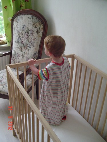 Wil nu steeds op schoot, eraf, spelen, op schoot, eraf, spelen, op schoot. Even time-out dan maar. Jas aan, in de buggy naar het balkon. Het waait lekker, dus wuivende bomen en Bartus kijkt en kijkt. En dan ineens zakken z'n ogen dicht. Oeps!! Da's niet de bedoeling, vandaag voor het eerst slapen in bed! Gauw naar binnen, boterham eten aan tafel in de kinderstoel, auto's en fietsen brengen hem weer bij de tijd, bâbâ, ja buiten - auto - ô-ô - precies - psis. Goed, boterham op, laatste roosvicee gedronken, schone luier. Kom we gaan slapen en ik til hem de trap op. Bart kijkt verbaasd, wat gebeurt er nu? Ja boven slapen in je bed. Broek uit, sokken uit, slaapzak aan. Ik leg Bart op z'n rug, beertje in z'n hand, muziekdoosje aan, zo kun je lekker slapen, knuffels en ik ga in de stoel zitten met m'n ogen dicht. Bart kijkt beduusd, ???????? Na 1 min. rolt hij om, gaat zitten, kruipt naar het voeteneind en gaat staan. Ik "slaap" door. Bart kijkt naar buiten en zegt hèè, ik: hmmhmm lekker slapen en hou m'n ogen dicht (kijk door m'n oogharen). Al heel snel gaat Bart weer zitten en kijkt naar buiten door de spleet in de gordijnen. Na 2 min. kijkt hij zo glazig dat ik bang ben dat hij omvalt. Ik leg hem dus weer neer, knuffeldeknuffel, beertje in z'n hand en weg is Bart.
