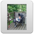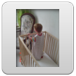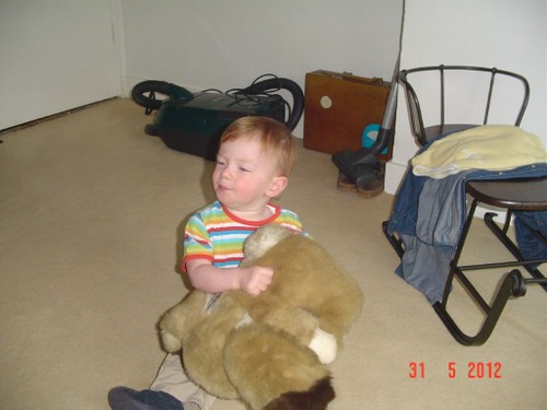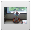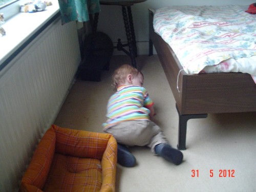 Ik hoor weer zachte geluidjes. Bart is op z'n buik aan het wakker worden. Lekker een lange ruk gemaakt! Ik ga in de stoel rustig zitten wachten tot hij bij de tijd is. Dan rolt hij op z'n zij, weer op z'n buik en ineens is hij wakker, kruipt naar het voeteneind en gaat staan, wijst naar poe-beer, kijkt naar buiten en slaakt strijdkreten. Lekker geslapen mannetje? Ik til hem naar mijn kamer en kleed hem aan op mijn bed. Ik ga nog even de was vouwen en Bart inspecteert de kamer en drinkt wat water. Eerst het konijn, lekker zacht, knuffelen, dan wijzen naar poes: pus, ja das poes. 'Pus-aai, nee, niet aai, poes is oud, moet slapen, pus-aai, neenee, niet aai, poes oud. Poes gluurt ondertussen naar de bedreiging van haar rust terwijl Bart steeds dichterbij kruipt. Nee-nee, niet aai, maar poes wacht het niet af en kruipt onder het bed. Weg poes, hùù?? Bart gaat op zoek, poes is onbereikbaar, hij vindt nog wel een pluis en dumpt die heel attent in de mand waar ze in lag! Ik ruim de was op en Bart gaat voor de vensterbank naar buiten koekeloeren. Wil je nog even op de vensterbank staan? Ha, daar kun je een hoop van buiten zien. Dan nog aan even 1 hand wijdbeens lopen naar zijn kamertje (verder wennen), Bart ontdekt het koffertje in de hoek, ik maak het open en Bart haalt de badspeeltjes eruit en is bezig. Kom, we gaan naar beneden, speeltjes in de koffer en Bart zet de koffer weer in de hoek waar hij hem gevonden had.