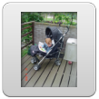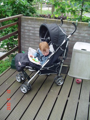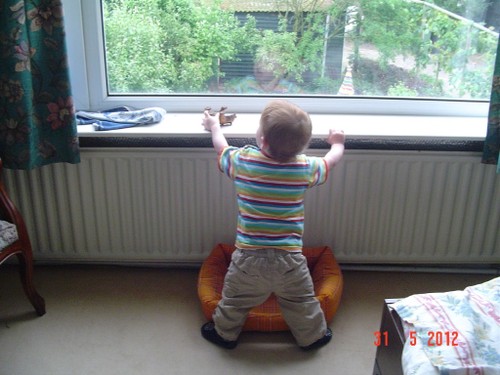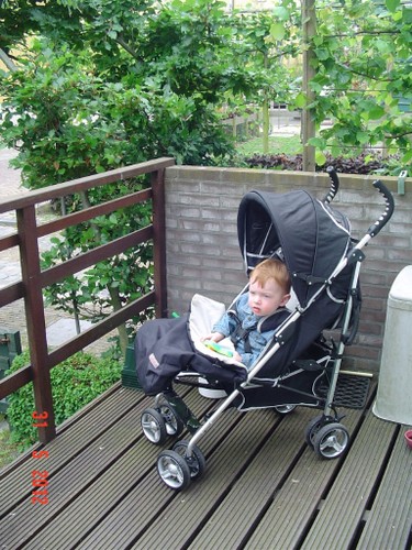 Gaat staan en wijst over de rugleuning naar de buggy. Wil je daar in? Ook goed, vooruit maar, jas aan, in de buggy met smileyrammelaar naar balkon. Bart beschouwt zwiepende bomen, ik vind het maar koud in die wind. Gelukkig heeft hij er na 10 min. genoeg van, smijt rammelaar op de grond en gaan we weer naar binnen. Even time-out in de wipstoel dan, Bart speelt met rc en kleine boekje. Ook niet goed, eruit, op schoot op de bank voor het raam, hangen, liggen, ogen wrijven, staan. Eraf en verder spelen.