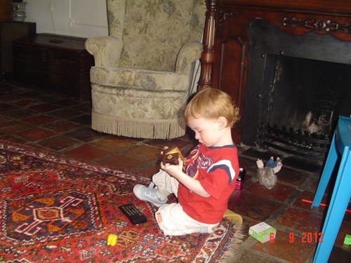 Bart besluit: kame! en loopt naar z'n tafel. Af en toe sitte, pusse(stukjes) pakken en op de sond, bokke idem, lego idem, met auto op de grond bwoem-bwoem en wielen bekijken.