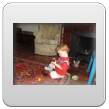 Bart komt naar me tappe: buite-buite. Nee nog niet, strakjes, tuin is nog een beetje donker en nat. Dan: tappe-tappe-keuke. Daar legt hij nog eens zijn bedoeling uit: buite-buite en bij de deur probeert hij de deurkruk te pakken: ope! Nog een keer uitleggen: strakjes. Dus maar met "zijn" kast spelen, kan ik even eten. De keukenvloer ligt al gauw vol met de inhoud van zijn kast. Daarna spelen we verstoppertje, Bart achter de deur van de kast en ik achter de buffetkast: kiekeboe!!!, schater-schater. Nog wat rommelen met "hand".