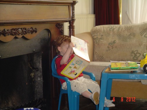 Ik hoor gebrabbel, even later is het echt kletsen: mama-oto-papa-fies-oma-oma-uit-uit. Hai baasje, Bart kijkt me rozig aan, aankleden, geen poepbroek gelukkig. Beneden boterham op, drinkt een beetje fruitsap en fruithap is NEE! Tijdens eten: oto-fies-motow- bomme-boot, er is een hoop te zien buiten.