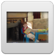 Mama brengt Bart + de nodige overlevingsattributen voor meneertje. Hij begint gelijk te kletsen en loopt naar de kamer. Sas uit, daarna mama knuf en naar de keuken uitzwaaien, alles lopend! Gelijk maar drinken en rijstkoekjes pakken. In de kamer drinkt hij een paar slokjes en neemt 2 hapjes koek, zet de zaak vervolgens op de tafel en gaat naar z'n speelgoed. Eerst natuurlijk doosje: ope - dis, bis bis bis, open gaat met een theatraal gekreun, als het niet lukt, komt hij naar mij toestiefelen: open! Dan het popje, héé, haartes: aai-aai, oogjes, been, am, foete, haartes-aai. Pop en doosje inmiddels gedropt op de sond en even op de bank wat drinken en nog een hapje koek eten. Ziet de fotobeker in de boekenkast staan: wjoe-aai-aai, en een vingertje aait over de foto. Op de foto staat Dewi die daar ook ongeveer 10 maanden is! Nog een hapje koek, dan tijd spelen met ballenbaan, krijgt blokjes nu op de goede plek terug en de ballen eruit. Verder: sitte, neemt plaats in zijn zetel en leest boekje.