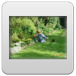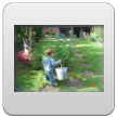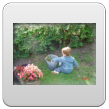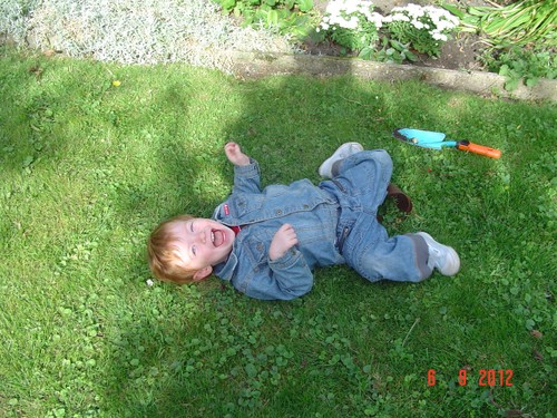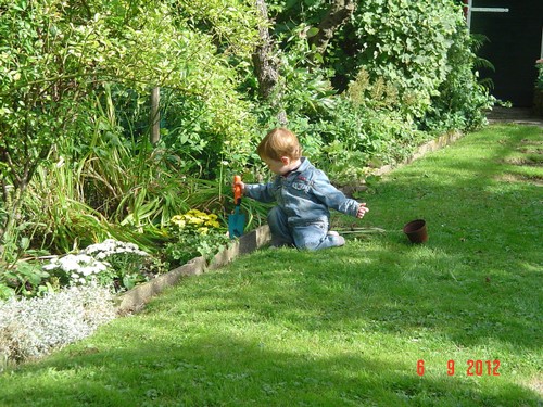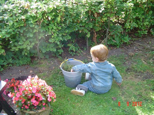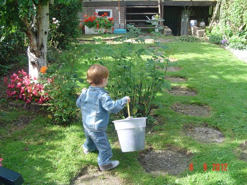 Naar de tuin. Spelen zandbak, ik haal onkruid uit gras. Na 10 min. doet Bart mee, plukt ook "tuit" en stopt die in de emmer, maar even later is het leuker om het in de zak van m'n bodywarmer te stoppen. Nee, niet daar, in de emmer. Bart gaat aan de haal met de emmer en gaat zelf tuit uitzoeken. Hé kip! kijke, helaas kip weer weg. Bart is nu halverwege het grasveld en gaat liggen rollen, wat doe je nou? ga je slapen? grijns-grijns. Dan ga ik wat plantjes poten, Bart helpt mee door de lege potjes te pakken. Dan pakt hij zelf de schep en gaat ook poten. Een vogel landt vlakbij, Bart kijkt, aai-aai. Mis, vogel weg. Afgeleid gaat hij nu richting balkon en ontdekt de hark: lekker groot!!! lekker mee hannesen. We worstelen zeker 10 min. met dat ding, Bart kan er niet genoeg van krijgen. Hij gaat ermee staan en valt steeds bijna om als hij die lange stok probeert te hanteren. Ik blijf de bovenkant vasthouden maar daar is Bart het niet mee eens: uit-uit!! en probeert mijn hand weg te duwen. Nee, anders krijg je au.