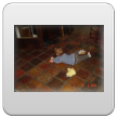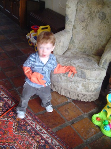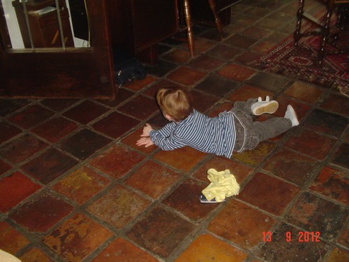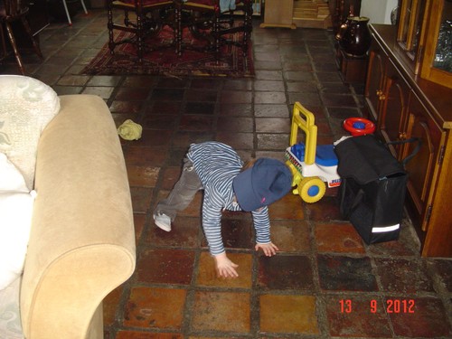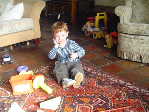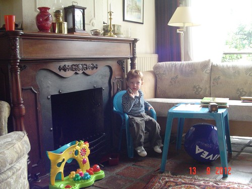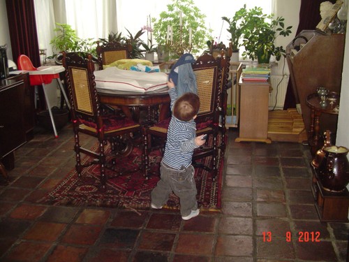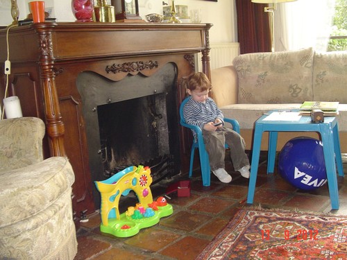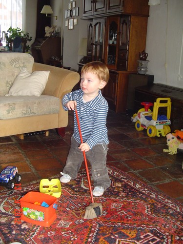 We zwaaien papa en mama uit vanuit de keuken, even de zaken op een rijtje: papa oto - mama oto. Juist en papa en mama komen strakjes Bart ophalen. Dan ontdekt hij de kleine bezem: pakke, ja pak maar, is bezem: bese, kun je mee vegen en ik doe het voor, niet nodig, Bartus pakt het ding uit m'n hand en gaat de keukenvloer sege. Deze ruimte is duidelijk te klein voor een schoonmaak dus banjert hij naar de kamer met zijn bese en veegt een tijdje het kleed. Dan schiet hem ineens iets te binnen: siek aan, en om mij de zaak goed duidelijk te maken, loopt hij met bese achter de bank en prikt met een vingertje op de cd-speler. Oma drukt de noppe in, siek aan, grijns, bese wordt gedumpt en hij gaat naar de keuken. Hmmm? niet dansen? Nee oma, het gaat nu alleen om de juiste ambiance. Keuke - kas - ope, helft van de inhoud wordt eruit geflikkerd tot hij hand te pakken heeft. Aan, is daar een tijd mee bezig, maar het lukt hem niet om ze allebei tegelijk aan te krijgen: oma aan, ik help even. Met allebei de handjes in een roze handschoen terug naar de kamer en naar het raam: kippe kijke. Geen kippen, hand uit en verder spelen, oma oto aan, Bart bestudeert de draaiende wielen, bis-bis-bis, koek opeten en drinken. Dan ontdekt hij de la in de tafel: ope! Nee die moet dicht blijven maar ik geef hem wel een oude telefoon uit de la, soon! Daar is Bartus een heeeele tijd mee bezig, eerst: sitte hai, Bart is aan het bellen, ik antwoord met mijn telefoon, dat doen we -tig keer. Dan gaat hij toe sitte en is een tijd bezig met de noppe, soon - hai - uit - aan.
