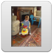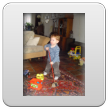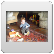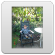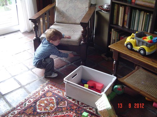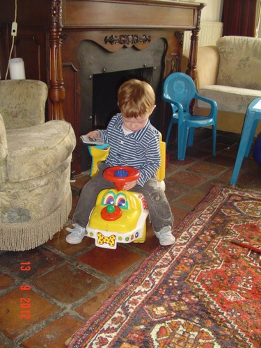 Uit (de stoel) met soon en naar de loopauto: sitte. Ik help hem en we rijden samen met soon naar de keuken, ik moet ontbijt halen. In de keuken wil Bart uit, ik help hem van de auto af en hij gaat weer bellen: hai - uit - hai - uit - hai. Dan probeert hij soon in z'n sak te stoppen, ik help even, uit - sak - uit.Terug naar de kamer en tas uitpakken, Bart pakt z'n popje eruit, pop, en gaat liggen, wil je even slapen? Efe sape, grijns. Dan wil hij z'n pet van de stoel, zet hem op en hangt de clown uit. Met soon dan naast me op de bank en herinnert me eraan dat de cd is afgelopen: siek aan! en ziet weer de fotobeker: wiejoe, grijns, aai. Verder spelen maar beweegt een beetje wiebelig, dus tijd voor iets anders. Kom we gaan naar het park, dat vindt baasje een uitstekend idee: pawk - sitte, loopt direct naar de buggy en gaat er zelf in zitten. Sas aan - oma sas aan - oma bille aan. Jaja, nog even brood pakken.