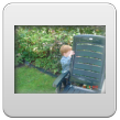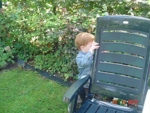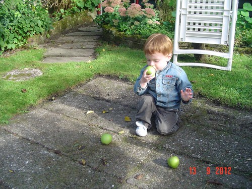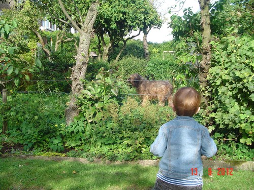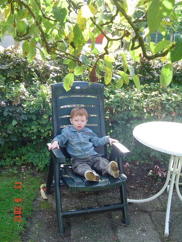 Het wordt tijd, Bart is nog diep in slaap en het kost een beetje moeite om hem wakker te krijgen, vind ik niet leuk, maar anders slaap je vanavond niet baasje. Na paar minuten is Bart bij de tijd: dijn ope! uit - uit - boek aan. Beneden boterham eten en rest fruithap op, beetje drinken. Dan sas aan, auto, bese en pom mee naar buiten. Sand seppe emme, emmer weer leeggooien in bak, op! opnieuw seppe emme en weer leegooien, kletsen-kletsen-kletsen. Dan kiekeboe achter de stoel, schateren en erin zitten. Ik pluk de laatste appels uit de boom: appew, Bart is een hele tijd druk bezig met appew wuike, mmmm en kletst ze tegen elkaar. Legt ze neer, raapt ze op, ja pak maar bij de steel, teew, doet ze in z'n emmer, dan in de zandbak en er weer uit, wuike. Tja nu zit er zand aan en dus zand aan z'n mond, Bart spuugt brrr, schoonmaken, niet aan je mond! Er vliegt een helikopter over: koppe. Ineens komt de hond van de buren in hun tuin, Bart schrikt, geeft een schreeuw en schiet naar me toe, maar na 2 sec. is dat over: hond, aai. Nee, niet aai, alleen kijken. Bart staat te kijken hoe het enorme beest uit hun vijver slobbert. Verder seppe, buurman is bezig met timme, oto en fies over het pad, vogels, vlinders, prikt met vingertje in sas (gras)- nat, kiekeboe achter de rozenstruik.