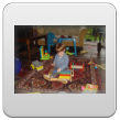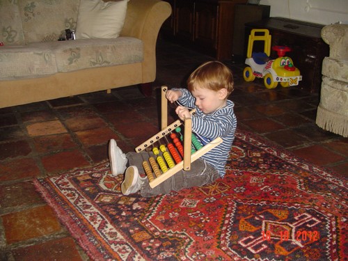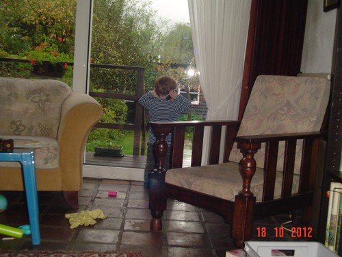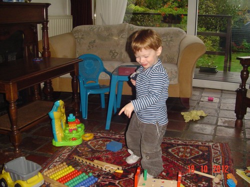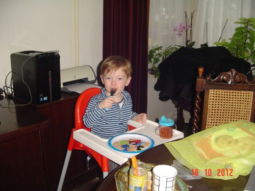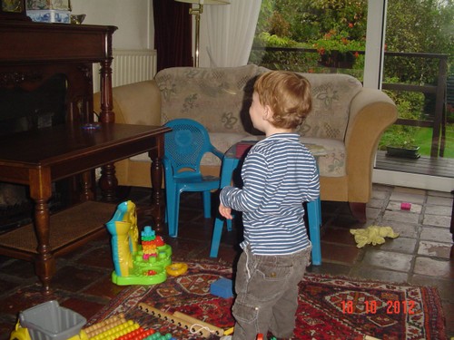 Bart is nu hardop aan het kletsen, dan: bons, bons, bons, even kijken, popje, hond en beertje uit bed gegooid, "oma, oma pakke". Kleren weer aan, ga je mee? "sitte, buite kijke, saapsak dis". Ik ga maar in de stoel zitten afwachten. Na paar min. "uit-uit", beneden brood en rest fruithap eten (met een paar trucjes). "taan toe, otoos kijke", ondertussen staat hij te knetteren, pfff heb je poepiebroek? "Oto, siets, boeme, boot". Dan uit de z'n stoel, "toe oma suive", we schuiven samen mijn stoel tegen de tafel. Nog een keer vragen: heb je poepiebroek? "oma kijke", ja hoor, verschonen dus. Bart is een "kinkebom". Dan wijst Bart: "nikke nuis", nou nog eentje dan, meneertje speelt intussen met hamerbank, vormendoos en ballenbaan. Is een stukje fitter dan vanmorgen. "Nijn buite", voor het raam even kijken.