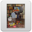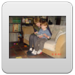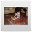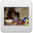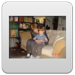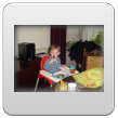 Even naar de keuken mijn ontbijt maken, Bart speelt met "kas, hand, pomp, bese" en weer zomaar een huiltje, gelukkig kan ik hem afleiden: "duif, buite". Dan "op, kippes kijke" op het aanrecht en even knuffelen. Terug kamer, hele tijd dierenboekje lezen op schoot, Bart wil steeds terug naar bladzijden: "poes kijke".