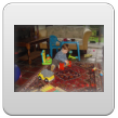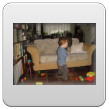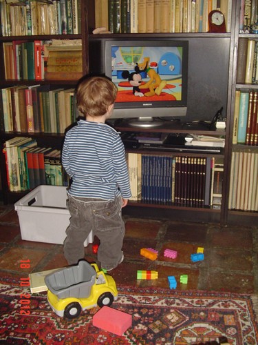 Marcheert naar binnen en gelijk door naar de kamer, "has uit, kok pinge, has uit". De Bart is gearriveerd. "Koek", stampt naar de keuken, doet de kast open terwijl mama en ik een beetje overdonderd in de deuropening staan te kijken. "Je hebt ook je pap niet opgegeten" (mama). Interesseert baas niet, hij pakt de zak, "koek". Eerst gaat mama weg, "mama huis, mama saaie". In z'n enthousiasme stoot hij zijn hoofd tegen het raam, boem, huilen, toch ietwat ongecoördineerd. Gauw knuffels erop van mama. Dan "sap make", in de kamer hoeft hij vervolgens geen koek en geen drinken maar gaat het nieuwe speelgoed checken: glimmerboekjes en worstelen met telraam, even rijden op de loopauto, "kok pinge". Gaat dan een beetje wild zitten voor de hamerbank, "bille au", op schoot dierenboek lezen. Na 10 min. van schoot af, weer boem, huiltje zonder tranen, mannetje staat ietwat onvast op z'n stutten vandaag. Weer even op schoot knuffen, over en verder. Wrijft steeds over z'n neus, "neus nat", ik zie niks maar we gaan toch maar even schoonmaken, 't zal wel kriebelen. De blokkenkoffer: sluiting is intrigerend, Bart is er zeker 10 min. mee bezig, "ope dis", daarna blokjes in de goede openingen van de vormendoos. Komt een beetje drinken, pats weer op z'n gat, weer huiltje zonder tranen (begin waterpokken?). Ik zet de Mickey Mouse dvd op, Bart staat eventjes te kijken en te wijzen, "nikke nuis!" en swingt mee met de muziek. Na 5 min. gaat hij verder met z'n hamerbank, de speelgoedkrat-zeul-zeul, prinsesseboek-hmm-weg, "kok pinge". Als er muziek klinkt, kijkt hij "nikke nuis" en swingt mee. Tussen alle activiteiten door: ogen wrijven, neus wrijven, veel struikelen maar blijft nu gelukkig staan, koek halen, slokje drinken, "neus nat", op schoot boekje lezen.