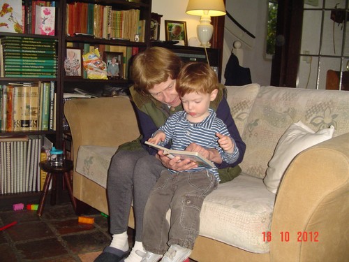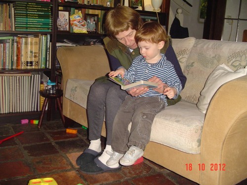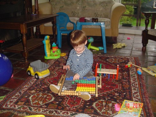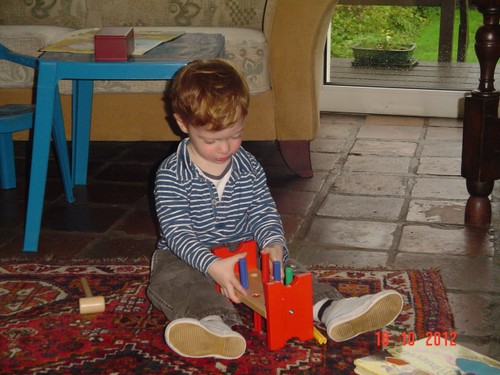 "Oma timme", we timmeren samen op de stokjes van de hamerbank, pakt z'n popje, huiltje, weer op schoot, hondeboek lezen, "hond pele, hond semme, hond sape", verder hamerbank, huiltje, knuffel, zitten aan z'n tafel, ringentoren, meezingen boze bolletje, huiltje, eendeboek lezen op schoot, "kok pinge" (ik tel de slagen mee, grijns),