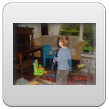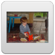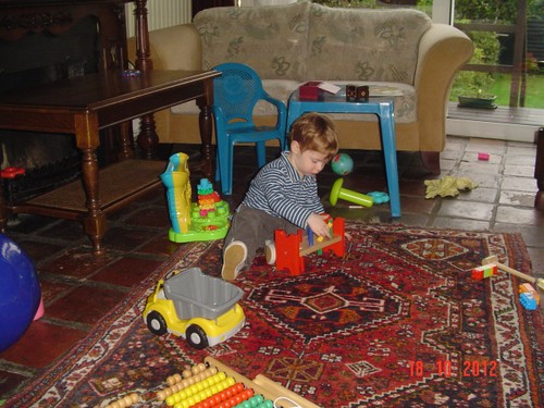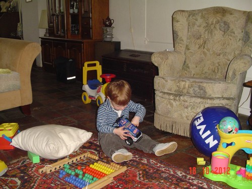 Van schoot, "penne op-wuime, Bart sijve, penne sond", weer huiltje, pakt popje, "oma opkille", knuffel, "duif kijke, boeme wuike", geeuwen, meezingen liedjes. Weer van schoot, spelen raceauto, "oto lijle, kus" (oto krijgt een knuffel). Neus wrijven, huiltje, ballenbaan, lego, gooit met blokken en gooit kussen van de bank, bonkt dan ineens met knuistje op het kleed + huiltje, knuffel, wrijft weer over z'n neus, gaat dan liggen op het kleed en we doen hap-spelletjes, schater.