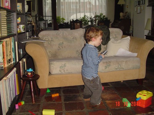 Het is droog buiten dus we gaan even "kippes kijke", dan over het smalle paadje naar de trekkers en vrachtwagens die "hellie make". Terug en even naar de andere kant, 't is modderig daar dus we kunnen niet bij de stapel "tene" die Bart graag wil bekijken omdat ik hem geen laarzen heb aangedaan, broek wordt wel een beetje vies. Terug, even "santebak kijke, binne, oma has uit, taffe aan". Terug binnen, even schone luier en dan krijg ik "bief oma, pen", ik krijg z'n blaadje papier in handen maar begrijp niet helemaal de bedoeling. Bart loopt heen en weer met z'n "penne", ik teken wat op de brief en dan komt Bart de krijtjes weer terughalen. Spelen hamerbank, achteloos: "oma soto make", telraam, "oma soto make", we tellen de balletjes van het telraam, als ik bij negen ben: en dan? "tien". Bart besluit dan dat hij "koek meer" wil, nee mannetje, je gaat straks eten, kom we gaan even opruimen. Maar Bart pakt z'n "soon", wie ga je bellen? "Wioe", Bart is daar druk mee bezig en meldt ondertussen "kok pinge" en wijst, ik ruim even op.