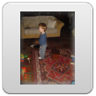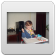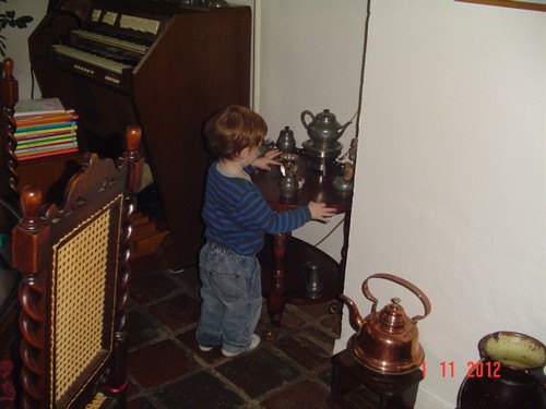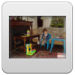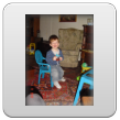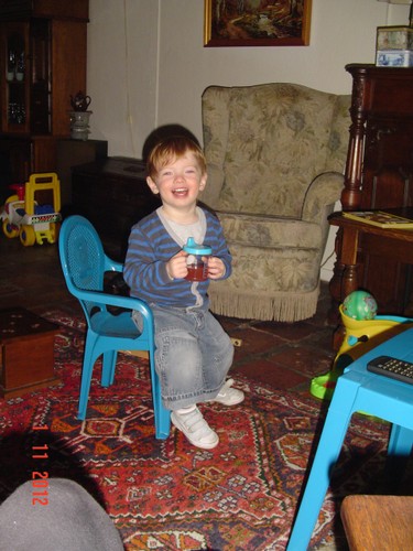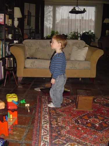 Commando: "oma siek uit (vingertje wijst), oma mikke nuis doen!" Bart staat te kijken en ik zet een stoof neer om op te zitten zodat hij niet te dicht bij de tv gaat staan; eerst "nee", dan gaat hij toch zitten. Blijkbaar staat de stoof niet goed want hij schuift ermee en tilt hem op: "ôdaaie, sitte"(omdraaien). Kijk uit dat je er niet af valt! Dan toch weer staan, 2 handen in z'n zakken: "hande sak, kok pinge", draait zich om en staat mee te swingen met de ding-dong, we tellen de slagen "ses, ag, tien, uit", en verder mikke nuis, maar de spanningsboog is dan gauw op dus: "duif kijke buite, inne niet (is er niet), koek hale, beke?" (hier op het tafeltje), Bart knabbelt z'n koekje en drinkt een paar slokjes naast me op de bank.
