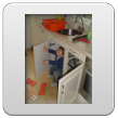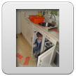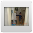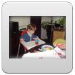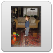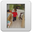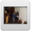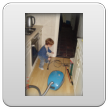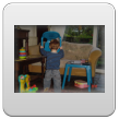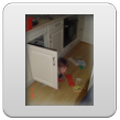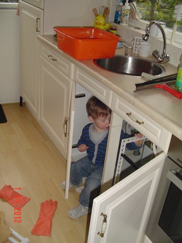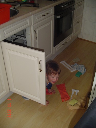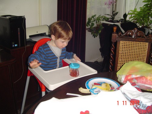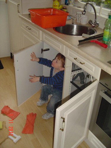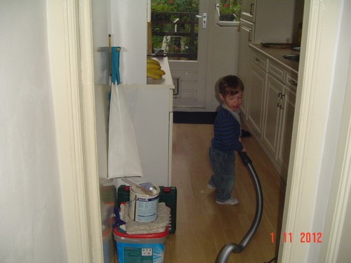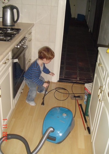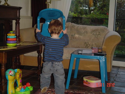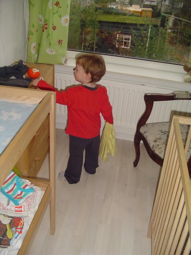 Kom, we gaan even naar de keuken stofzuigen (ik weet dat Bart dat leuk vindt): "Oma soffe make, tekke in, Bart soffe". Zo, nu kan ik even eten terwijl Bart de vloer zuigt. Klaar, ik doe het ding uit, had je gedacht: Bart weet waar de knop zit en zet het ding aan-uit-aan-uit-enz. Ik haal de stekker er uit: "tekke uit, ophuime, (ik doe het snoer er in, Bart trekt het er natuurlijk weer uit, veel te leuk) tekke in, (loopt met het snoer naar stopcontact in de kamer, nee, kom opruimen, snoer weer terug), ophuime (Bart sleept de stang achter me aan), kaar". Terug naar de kamer: "koek mir, koek op, sak pullebak, (keuken) sonne sem oma" (stang zonnescherm!). In de kamer kijk ik even op buienradar: "oma purk kijke" (regen wordt straks minder), baasje speelt verder en gaat dan terug naar de keuken, "kas ope, emme pakke, Bart pank hosmake, oma pakke, uit bofe (teil + dienbladen, de kast is nu leeg), Bart kippeboe, ton bofe (Bart meldt terloops dat de magnetron boven op de kast staat), au pijn (vingertjes weer klem, oma kus erop doen?), nee Bart kippeboe".