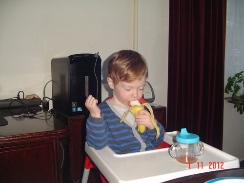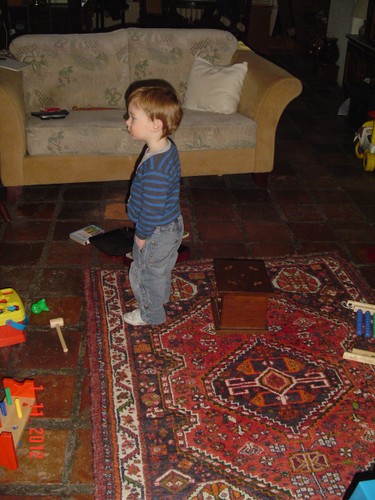 "Mikke nuis uit, tafe (Bart schuift het ding heen en weer, staat blijkbaar niet naar z'n zin), toe mee (zeult stoel naar het midden van het kleed), toe valle, (ik zet het ding weer rechtop), toe sitte dinke, koek mig" (meer). Zit pontificaal in het midden van het kleed te smikkelen. "Koek mig, soon pakke, (???), wioe belle (Liu), hoos belle (Roos), koppe dukke, (Bart staat voor het raam met de telefoon aan z'n oor), lege buite (regen), nat, sandbak nat, tonijn? nee, kijke - nee" (geen konijn te zien).