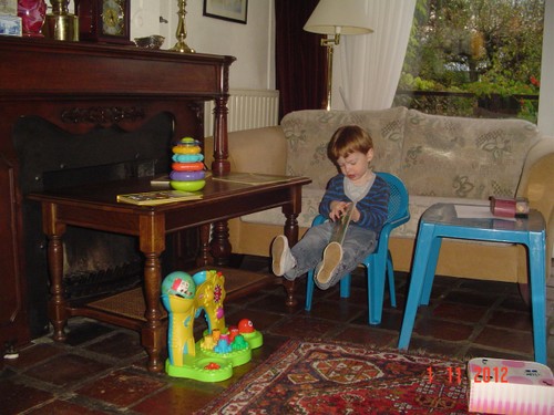 Bart gaat gelijk spelen terwijl mama en ik nog even kletsen. Na 10 min. naar de keuken: "mama saaie, mama oto, Bart kas koek pakke, kas dis, oma dinke make, (in kamer:) oma sak ope make, koek, siek aan" en Bart knabbelt z'n rijstwafel terwijl hij bezig is met de vormendoos. Ik kieper die leeg en Bart stopt alle vormpjes er feilloos weer in, hamerbank, boekje lezen, krijtjes pakken, komt steeds koek halen.