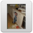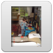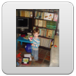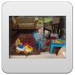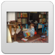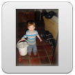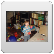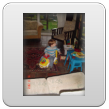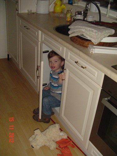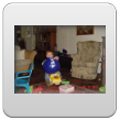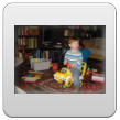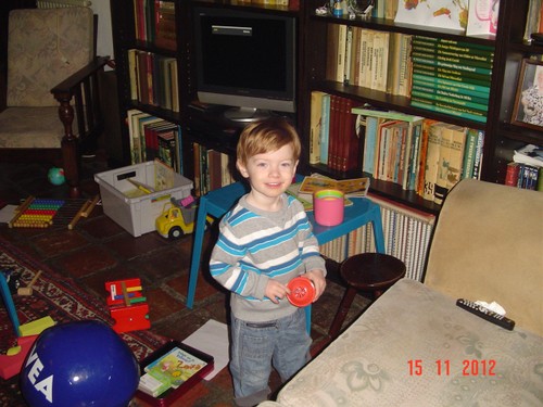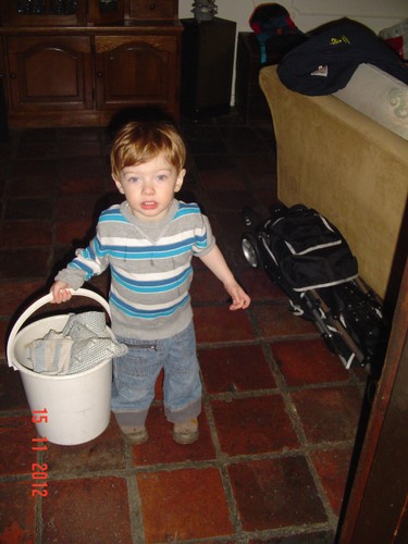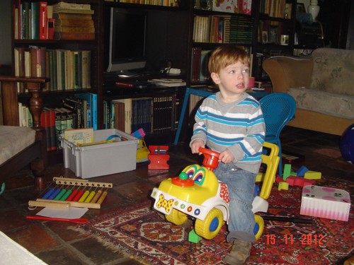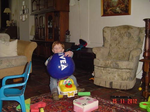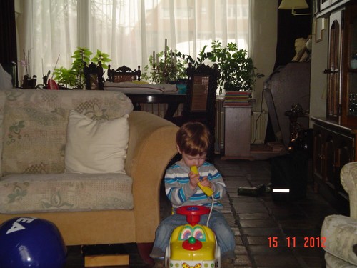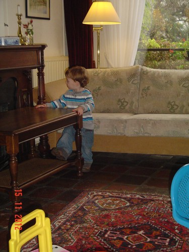 Tissoe ophuime, dinke op, meeg hale keuke. (Daar haalt Bart de kast weer leeg): oma pakke, bofe (= ik moet de boel op het aanrecht leggen), Bart kippeboe (zit in de kast in zichzelf te babbelen, kan het niet verstaan). Kame, koek hale, toe sitte, soon pakke, wioe belle, hallo wioe, Bart boem (schopt tegen z'n tafel), koek pakke (da's de laatste hoor), Bart dinke, waa beke? (in de keuken), keuke hawe, (terug kamer:), duif buite weg, kijke sien, baw pakke, oma base (nee hoeft niet), Bart base, Bart sitte (gaat op de bal zitten, daarna er mee gooien. Speelt verder met spullen uit de kist, telraam en ballenbaan. Hij is druk bezig dus ik gooi even een snottebel-zakdoek weg, alerte Bart:) oma nou? oma nou? (en scheurt achter me aan. We gaan nu naar het park, ik doe brood in een tas, ga je laarzen maar pakken).