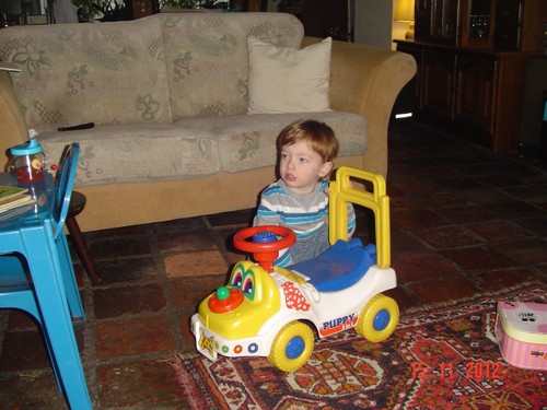 Auto lijle, dinke. Mikke nuis doen - siek uit. (komt zo, nog even wachten). Poes bofe, poes binne. Mikke nuis doen, kok aan sette oma (heb ik gedaan, klok slaat zo), Kok saapt (nee slaat, da's beetje moeilijk dus ander onderwerp). Mikke nuis kont (komt; ik zet alvast de tv aan: Sinterklaas is te zien). Mikke nuis kont, sinnekaas, mikke nuis kont. (Bart zit al die tijd op z'n loopauto): wiewe, dekke ope, beke in (nee doe maar niet je beker erin, dan valt-ie om als je gaat rijden, doe er maar blokken in). Koffe pakke, bokkes in.