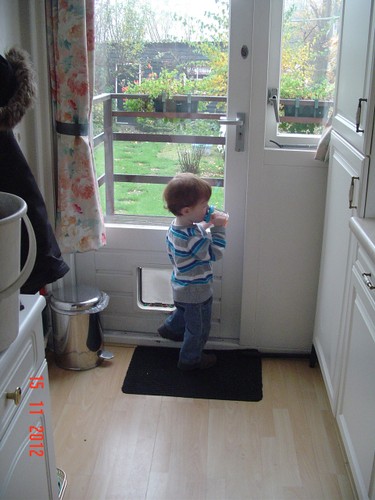 Hek ope, deuw ope make, lase uit, sap soeke keuke, buite koud, toet mee, appew mee. (Ik smeer boterhammen, Bart speelt in de kast en pakt daarna aanvullende lunchitems, nee hoeft niet, toet en fruithap heb ik al. Bart zet de spullen terug. Boterhammen worden razendsnel naar binnen gewerkt, yoghurt en fruithap er achter aan, beker wordt bestudeerd, ik leg uit dat op de achterkant cijfers staan.) Kip beke, sijfes beke, kip, sijfes-grijns-grijns. Toe boem boem (ramt stoel naast hem heen en weer, niet doen, dan valt de stoel), toe valle, toe au, (nee niet au, kapot en dan kun je er niet meer op zitten. Bart kijkt peinzend naar de stoel, dat vereist enige overweging, laat de stoel verder met rust. Lunch op:) uit uit.