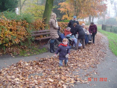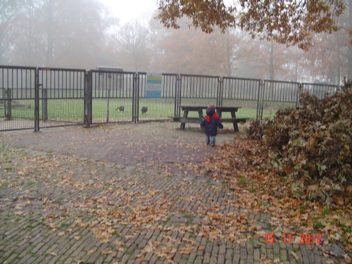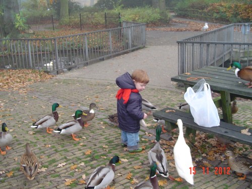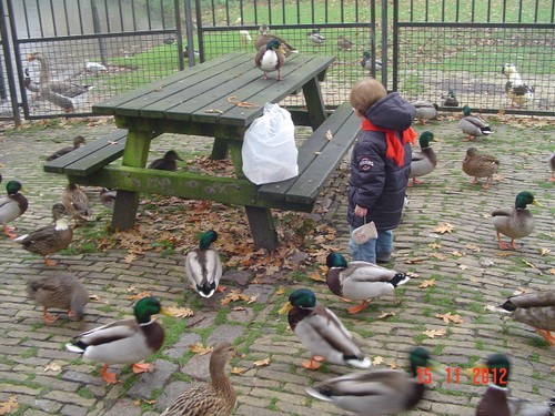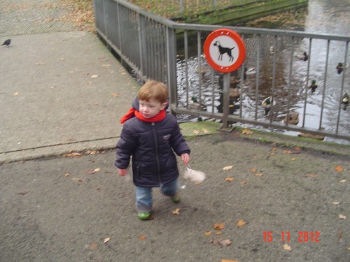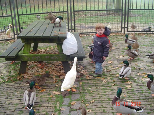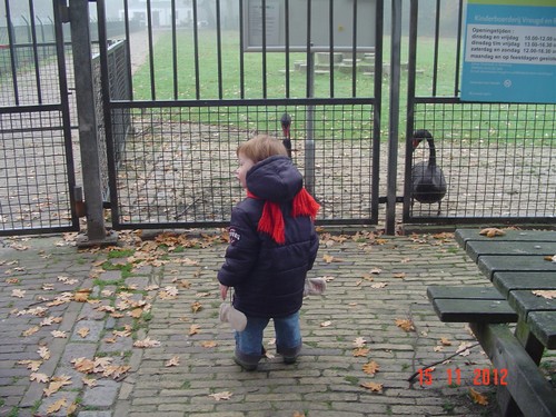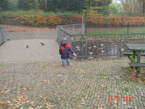 Lase aan, has aan, oma has aan, bille op, buite oto oma. (In het park deelt Bart brokjes brood uit, eenden grissen het bijna uit z'n handjes, maar hij gaat onverstoorbaar verder met strooien. Daarna heen en weer banjeren door bergen bladeren en kletsen, meeste kan ik niet verstaan door de bladruimers die in het park heen en weer rijden. Een meisje van ± 2 komt op hem af lopen, Bart staat grijnzend te wachten. Als ze tegenover elkaar staan, lachen ze elkaar een tijdje aanminnig toe en dan gaat ieder weer zijns weegs. De vader van het meisje vraagt: hoe oud is hij? 1½. Groot voor z'n leeftijd zeg! Bart stampt weer verder).