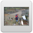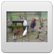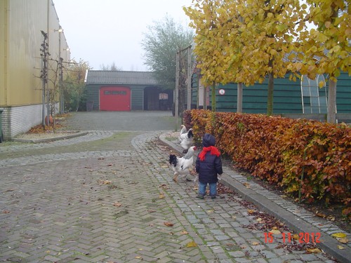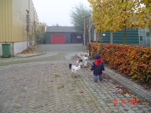 Kippes kijke!! (Uit de auto, Bart loopt naar de grote beesten toe en volgt ze een eind. Kom je naar binnen? Ik sta te vernikkelen). Nee, Bart kippes kijke. (Gelukkig verdwijnen kippen om de hoek en kunnen we naar binnen).