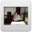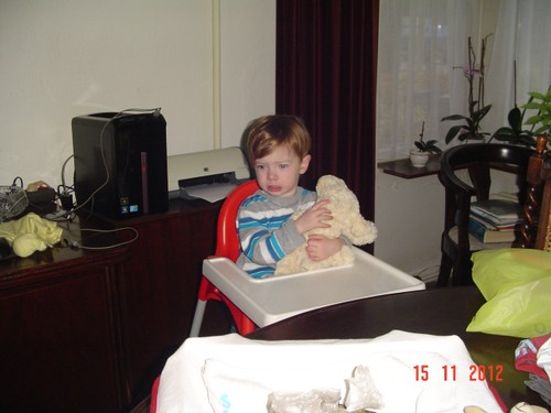 (Schone luier). Ophuime keuke, kippeboe, bese kame, Bart soffe. Tissoe op, oma hale. (Op schoot eerst even boek lezen:) poes soeke, vinne (vlinder), hond, pinnelin (pinguin), pinnin, 1 poes, grrr, waffis. (Laatste stuk liga op:) hanne soon make tissoe, beke soon (zitten een paar kruimeltjes op, 3e beker sap opdrinken), Bart dinke sap, donke buite, kijke, oma keuke tissoe hale, kas kijke, toet Bart, koek Bart, Wioe, emme mee kame, oma mee, (ik zet Sint cd op:) Sinnekaas (grijns en meedeinen), Bart pen kikke doen.
