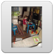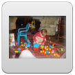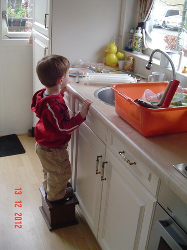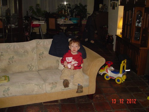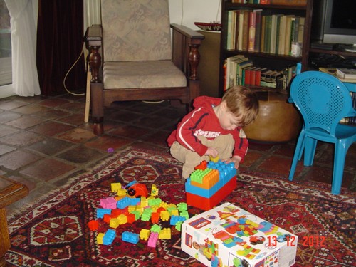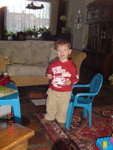 Ik ga even m'n ontbijt maken: "oma nou?" en meneertje loopt achter me aan. "Koek pakke", andere zak was leeg, dus: pak maar doos met nijntjekoek, weet dat feilloos te vinden. Weer op de bank koekje eten en wat sap drinken. "Efe buite kijke, kip happe, gavesien seppe, nee gavesien lijle", dan gaat Bart even "koke" aan de theetafel maar gaat al gauw weer naar de keuken om kast en broodtrommel te inspecteren. Dan weer op schoot op de bank koekje eten en sap drinken: "kip, sijfes (op beker), efe buite kijke, mmm kesboom". Waar heeft hij dat woord nou weer opgepikt??? "Hugzak, pop hond pakke", komt naast me op de bank zitten met pop en hond vastgeklemd, "koek meer", nee nou niet meer, we gaan straks boterham eten. Met pop en hond pakt hij weer het dierenboek, duwt dat in m'n handen: "boek lese". Samen op de bank boek lezen. Dan wil Bart z'n "hugzak ophuime, sond". Nee da's geen opruimen en ik leg de rugzak weer op de houtkist. "Pop hond bofe benge (nee strakjes als je gaat slapen), hier bijfe", precies. Bart pakt weer z'n dierenboek en gaat naast me "onnestebofe lese". Weer verder met de duploblokken bouwen, heel even met de vormendoos, maar da's saai want hij doet de vormpjes achter elkaar in de juiste openingen, geen uitdaging meer. Keuken: kast leeghalen en even kippeboe. Komt weer naast me zitten op de bank: "mikke nuis kijke", en wijst naar de dvd, ik wil die al aanzetten tot ik me bedenk dat het op zapp ook zo komt, dus tv aan.