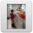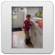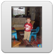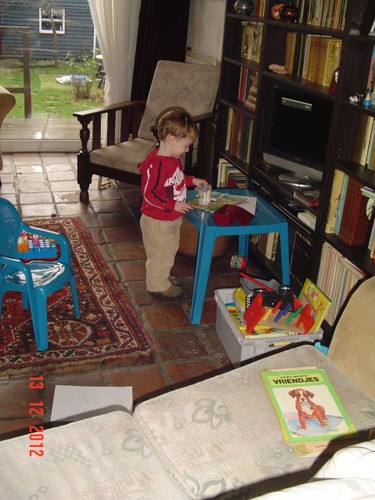 Bart komt grijnzend binnen: "hanne koud", tja wilde geen wanten aan. "Koek pakke" en mama uitzwaaien. In de kamer op de bank tegen me aan koek eten, ontdekt de duplodoos: "doos kijke, dekse af, auto bauw! auto hood!, bokke sas make, hos make". Bart is er een tijd mee bezig en haalt tussendoor rijstwafels. Dan wil hij "boeke lese, oma lese", pakt het dierenboek, duwt het in m'n handen en kruipt bij me op de bank: "o-li-fant, ko-ko-diw, aap, waffis, beer, poes soeke, sang, iek, etc.". Volgende boek wordt gepakt: "poes aaie, kus, hond kus". We werken 3 boeken door en dan wil Bart "siek aan" en praat mee met de liedjes. Ondertussen: "bief pakke, penne pakke, Bart sijve" en begint met z'n krijtjes te kleuren. "Koek pakke", en Bart gaat verder met krijtjes uitzoeken en kleuren, even later: "nieuwe koek", heb je'm nou al op? "JAA", en Bart pakt laatste rijstkoek uit de zak. Dan loopt hij naar z'n tafel waar de krijtjes staan, pakt rijstkoekje dat daar nog ligt, draait zich om en zegt glorieus: "Bart tee koeke", in iedere hand 1. Had-ie me toch mooi even te pakken! Dan: "boot, JA!", ik draai me om en vertel dat ik geen boot zie, "JA boot". Hm, zeker al weer weggevaren, kan natuurlijk ook dat Bart het 'geintjes uithalen' heeft uitgevonden, hij staat me tenminste grijnzend aan te kijken, de boef. "Efe buite kijke, duif sandbak". Verder kleuren: "nieuw pakke, dekse af, dekse op, bauw, hood". Deze keer heeft hij de kleuren niet goed, is ook moeilijk te zien bij kleine krijtjes.